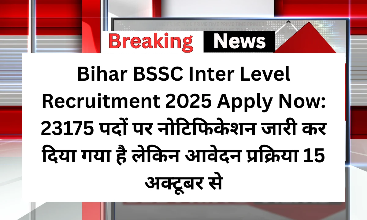 Bihar BSSC Inter Level Recruitment 2025 का इंतजार अब खत्म हो गया है। बिहार स्टाफ सिलेक्शन कमीशन (BSSC) ने 23175 इंटर लेवल पदों पर भर्ती के लिए ऑफिशियल नोटिफिकेशन जारी कर दिया है। अगर आप बिहार सरकार के अधीन किसी विभाग में नौकरी की तलाश कर रहे हैं, तो यह आपके लिए सुनहरा मौका है। इस लेख में हम आपको आवेदन तिथि, योग्यता, आवेदन शुल्क, चयन प्रक्रिया, आयु सीमा, वेतन और जरूरी लिंक की पूरी जानकारी विस्तार से बताने वाले हैं।