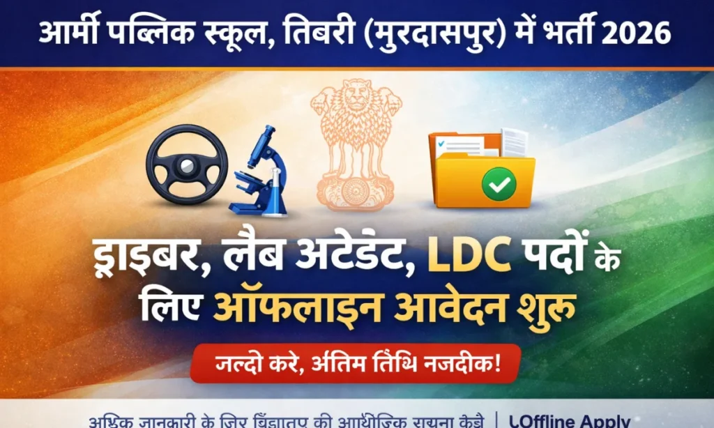 Army Public School Tibri, Gurdaspur ने विभिन्न पदों पर भर्ती के लिए आवेदन आमंत्रित किए हैं। यह भर्ती ड्राइवर, लैब अटेंडेंट (साइंस
