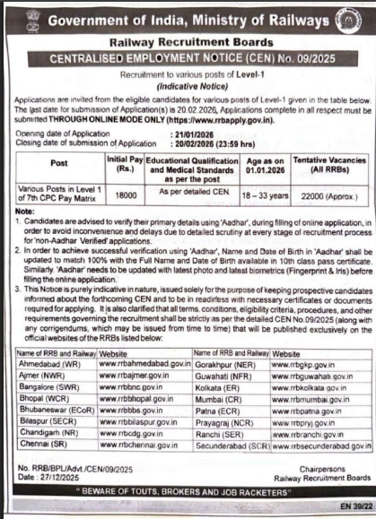 - कुल पद: लगभग 22,000